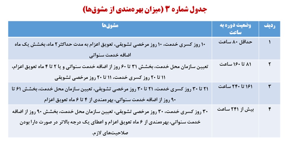 - بهره مندی از مشوق ها مطابق شیوه نامه ابلاغی ستاد کل بر اساس جدول زیر است: